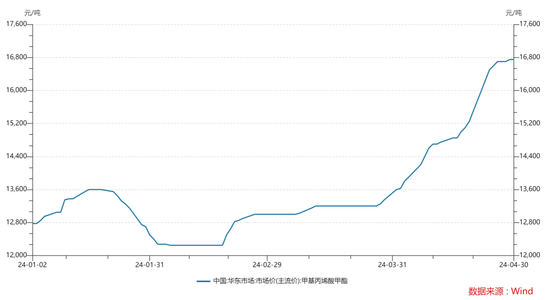 2024年以来,MMA价格进入明显的上涨结构,4月份开始进入急涨状态,价格创近5年新高,涨幅近60%。